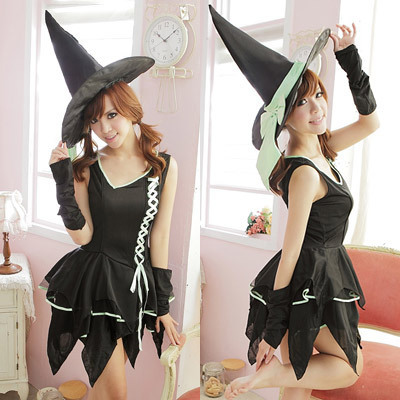 ネオングリーンのレースアップ魔女ドレス ブラック/グリーン